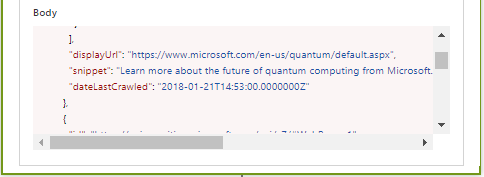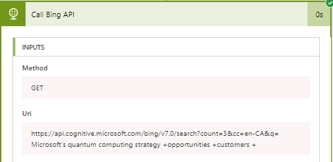 - There is an out of box Bing API connector, but for this scenario I have opted to use the HTTP action so I can control additional parameters including the cc query parameter which will localize the results. For example, if Mark is interested in more information about a carbon tax, it is important to return results in his locale as opposed to another jurisdiction which won’t have the same level of impact. We are also going to include a count parameter and assign a value of 3 to limit the result set to 3.