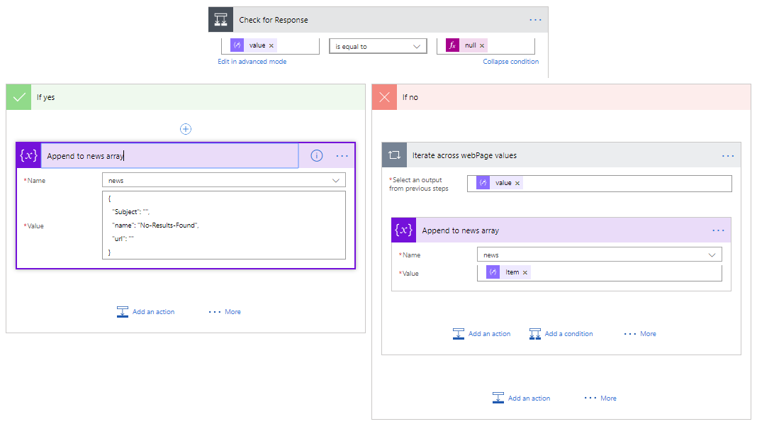 - Since we are not using the out of box Bing connector, we need to use the Parse JSON Response to have a typed message that we can use in downstream connectors. We also want to put a defensive check to see if there is a response. If there are no results from our web search, we want to prevent a failure from occurring. So when there are no results we will construct a “No-Results-Found” message and add it to our news array so that Mark knows there was no result for a specific email. If results are returned, we will iterate through them and append them to our news array.