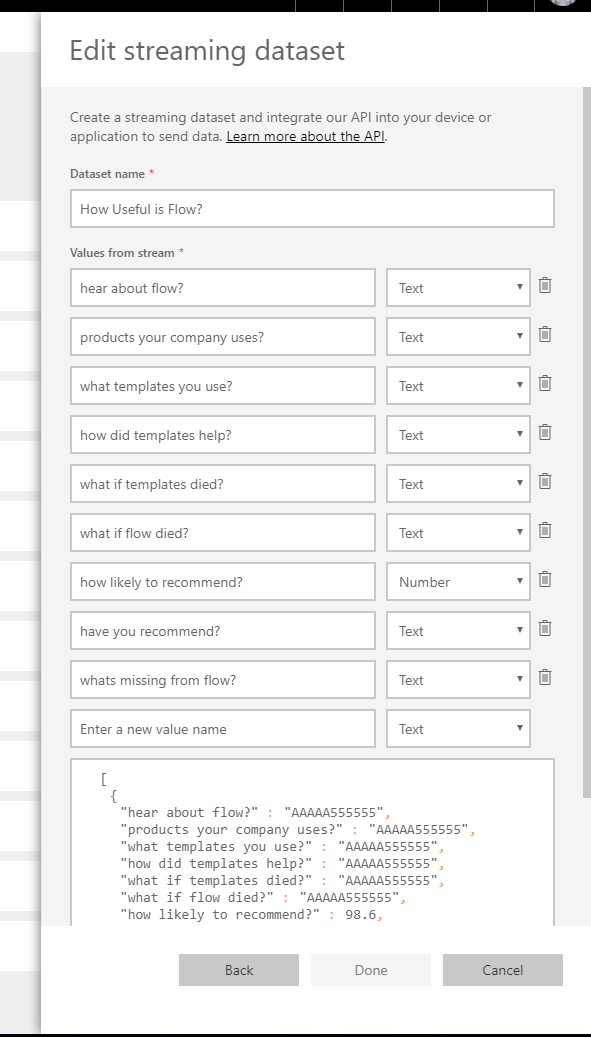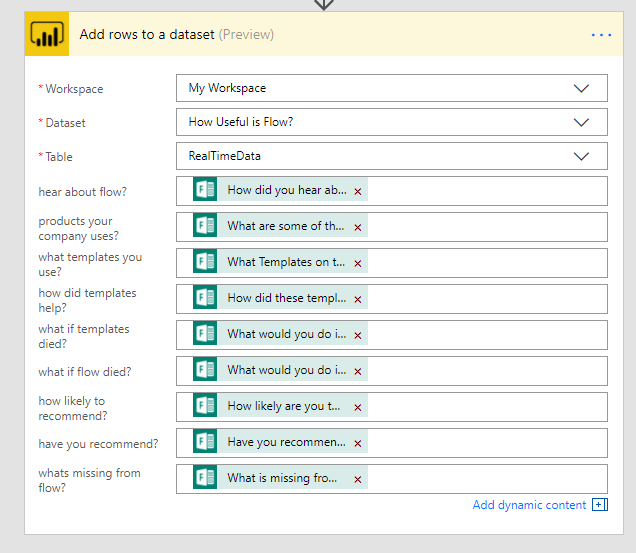 9. Go back to Flow and click on + New Step and then on Add an Action. Type Power BI in the box, and select Add rows to a dataset. Use the dynamic content to map the fields in your dataset to the corresponding fields from the form entries, as shown below: