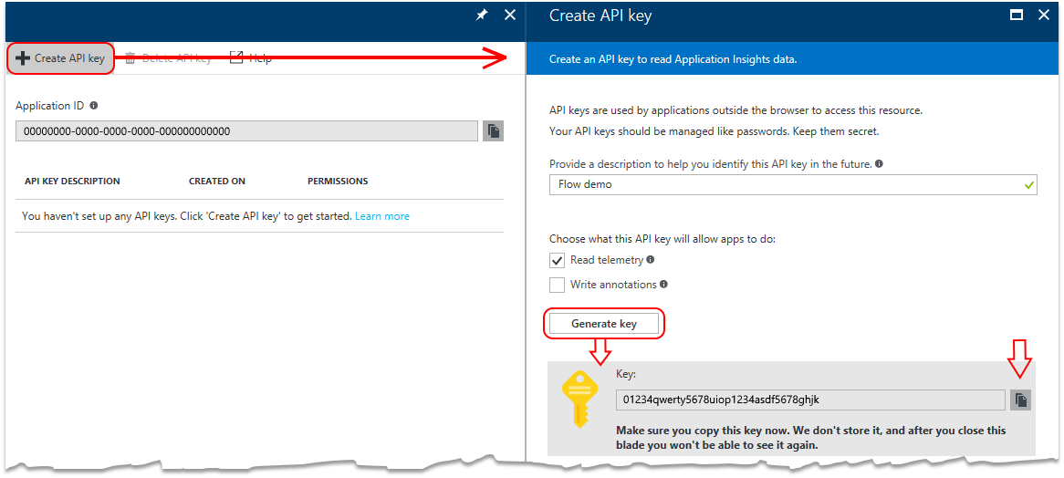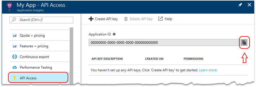 To query data from your Application Insights resource, you need an Application ID and an API Key. You can retrieve them from the Azure Portal as demonstrated in the following diagram:
