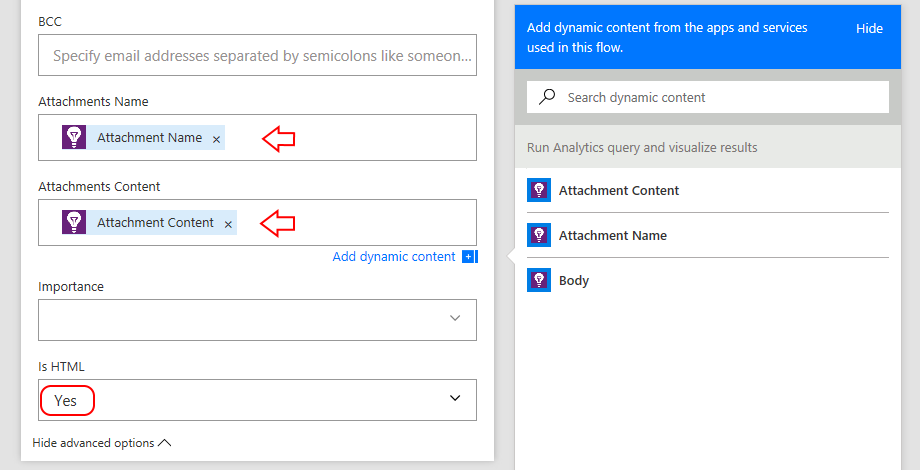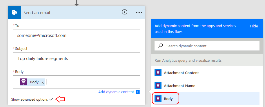 • Place your cursor in the Body field, and from the dynamic content menu that opens on the right, select Body.