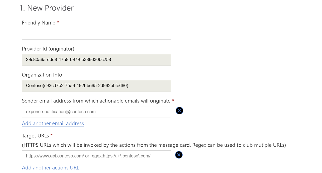 - Sender email address: Add the emails that you are going to use to send the actionable messages (Include the email group if you want to use a group)