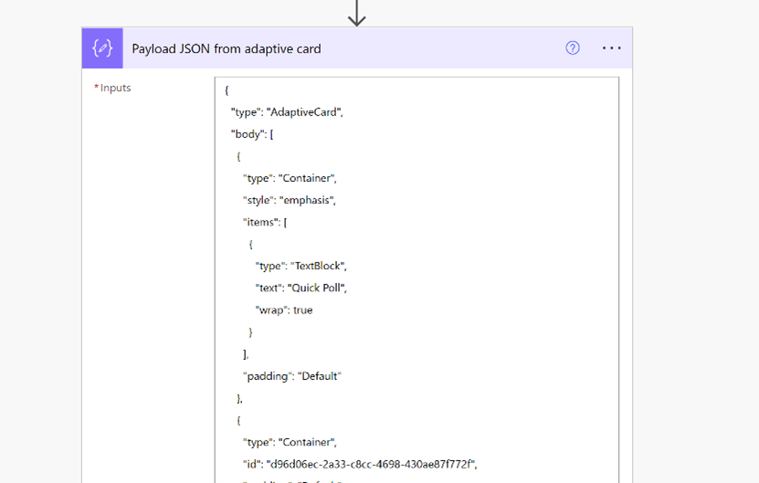 <script type=”application/adaptivecard+json”>”Compose output” </script>