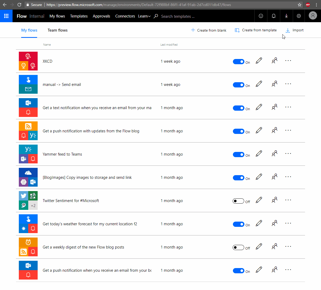 We are very happy to announce preview of packaging features in Microsoft Flow. With packaging, you will now be able to export a flow as a package and import it into a different environment.