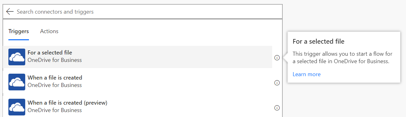 To set up a flow that collects inputs from OneDrive you can select the Flow button in OneDrive for Business and choose Create flow. This shows you a number of templates. You can also create a flow from blank inside of Microsoft Flow by choosing the For a selected file trigger under the OneDrive for Business connector: