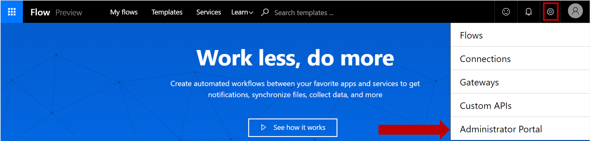 The Microsoft Flow Admin Center, (https://admin.flow.microsoft.com) allows you to create environments, manage permissions and set up Data Loss Prevention (DLP) policies, if you have admin privileges to an environment and a Microsoft Flow Plan 2. You can also find a link to the Flow admin center in the setting menu in the Flow portal. When you use the Microsoft Flow Admin Center, environments and policies that you create will also impact Microsoft PowerApps.