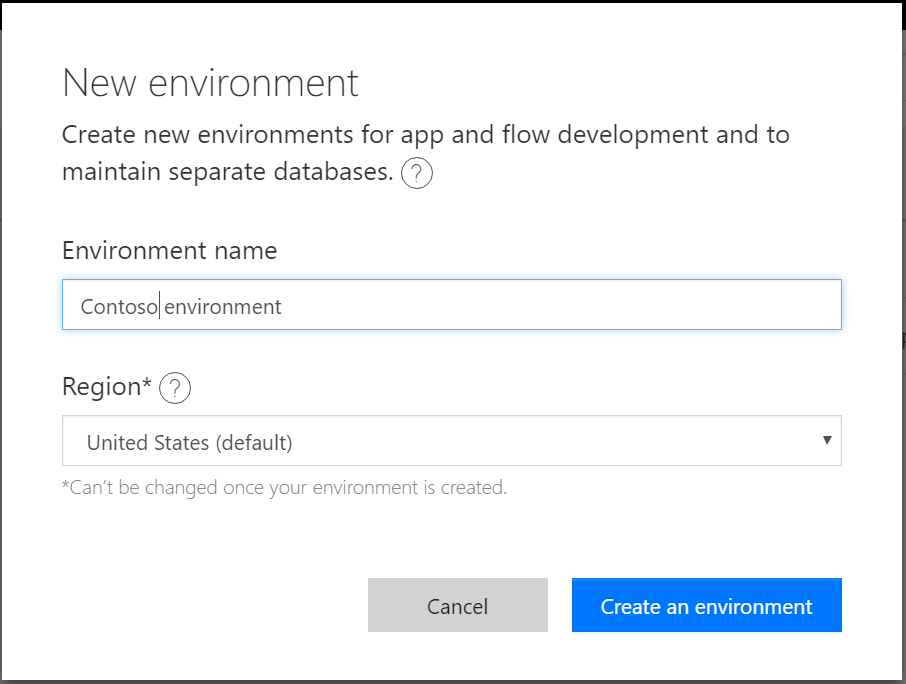 When creating environments be sure to be aware of the limitations of environments — since they are an isolation boundary you can never reference different resources across environments. For example, you can only access the Common Data Service from the same environment as where the database is. As a result, be sure to create environments only where you need them.