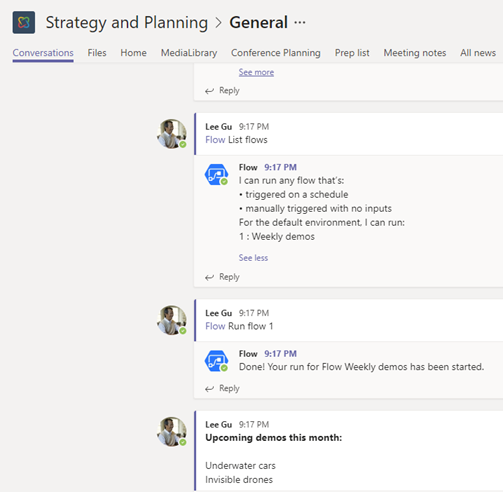 Just like the personal app, the Flow tab also includes a Bot that enables you to run manual flows and those triggered on a schedule. Let’s suppose that we have a flow that runs weekly and posts a message to the Team reminding everyone of upcoming tech demos. You can check out this blog post on how to create such a flow. With the Flow Bot, you can run this flow immediately.