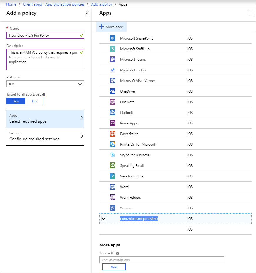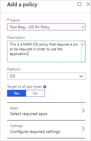 An administrator can create polices from the Azure portal. For the purpose of this blog post, we will create an App protection policy that enforces a flow user to require a pin when using the Microsoft Flow mobile application.