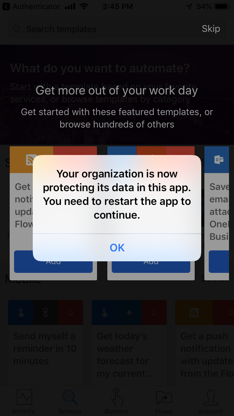 We have recently shipped a new version of the Microsoft Flow mobile application for Apple iOS and Android that supports Microsoft Application Management (MAM) without device enrollment. Using MAM allows IT administrators to create and enforce mobile data policies to safeguard company data.