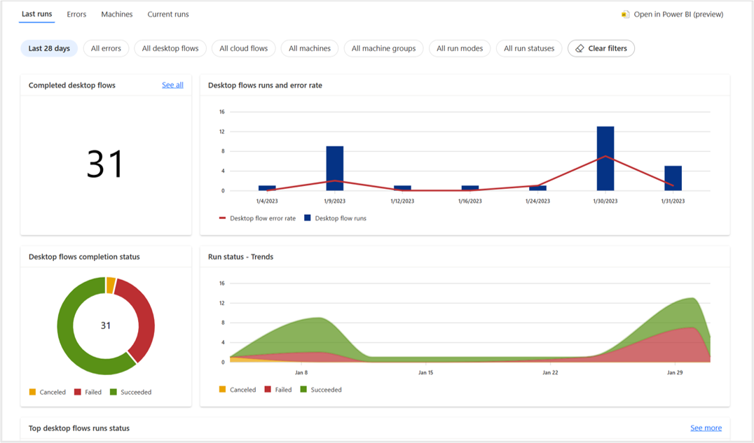 The Last runs section provides graphs and tables to get meaningful insights about your desktop flows runs, such as the number of runs, the percentage of errors, and the run modes.