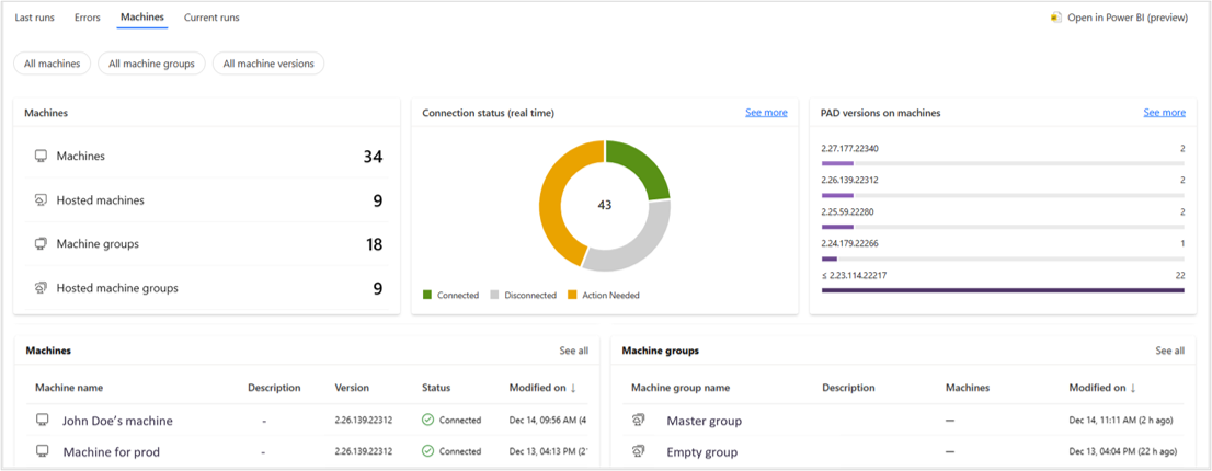 You can use the Machines section to monitor your machines and machine groups. These pivot tables provide information about the number of machines, groups, connection status, Power Automate for desktop versions installed on machines, and lists of machines and machine groups.