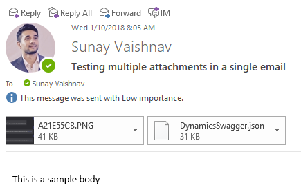 That’s it! Once you have successfully created and saved your flow, be sure to test it by exercising the trigger. You should see an email like as shown in your inbox with multiple attachments sent on a single email.
