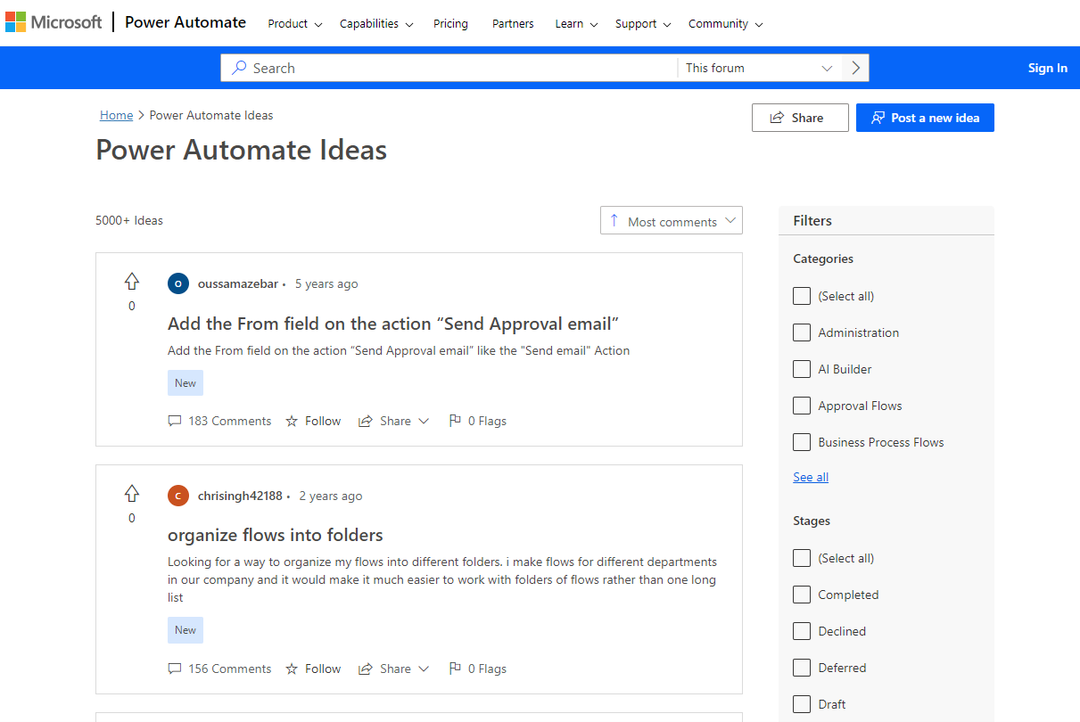 Fig 1. New Power Automate Ideas portal, available for desktop and mobile browsers