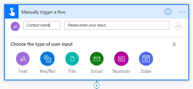 When you select the first trigger you can define inputs that you want the child flow to receive from the parent flow. For example, if the child flow is going to be creating a contact, it will need the Contact name and Contact email. Select Add an input and provide the details.