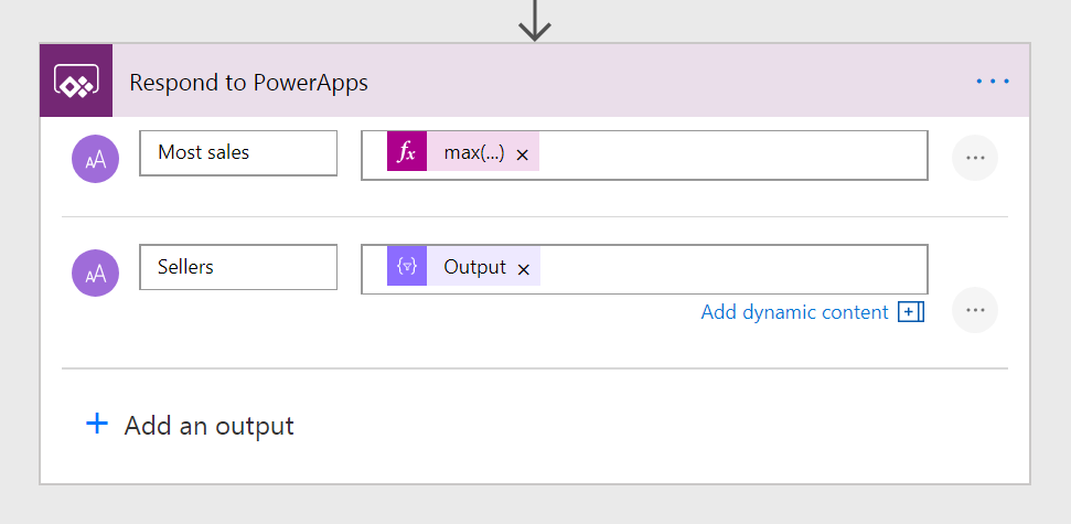 After you have built your flow and collected the data you need, add the Respond to PowerApps action. In this action, define the output fields you want to provide to PowerApps. Name each field, and select Add Dynamic Content to pass in data from the actions in the flow.