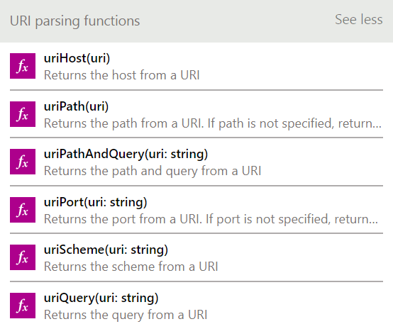 We are always adding new expressions to use in your flows. We recently added two new groups of expressions. The first helps you to parse URLs in your flows. Given a URL, you can select the hostname, path, port, scheme, and query segments. As always, all of the expressions are shown in the flow designer and have full intellisense support: