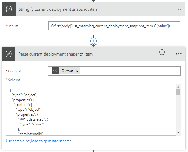 Since the filter on Current Deployment snapshot list returns a list of matches – even though it will always return a single item – we need to extract the first object of the list. We do this by using a Compose action followed by a ParseJson action. The output of ParseJson action can be used in subsequent actions.