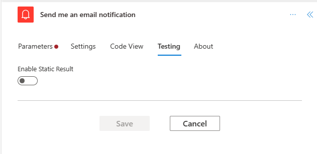 - Disable an action or set static (mock) outputs for an action – In the new designer, if you want to disable an action rather than remove it, navigate to Testing tab of the action and enable ‘Static Outputs’ and set it to 200 Succeeded. This essentially treats the action as successful without actually running the action. Similarly, if you want to see how your flow reacts if a certain action fails with a code/succeeds with a code, you can use the same capability of ‘Static outputs’ available on the action to mock the action execution to your needs.