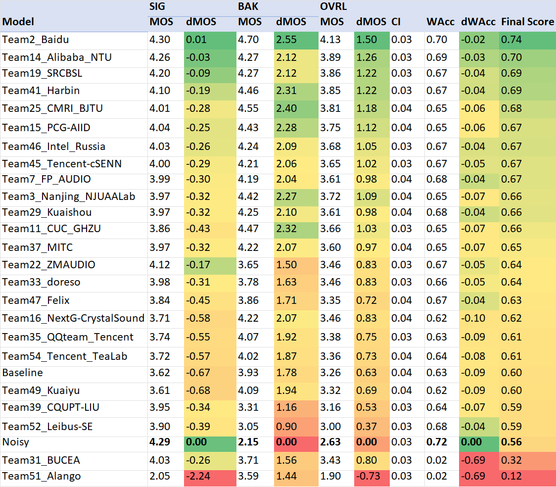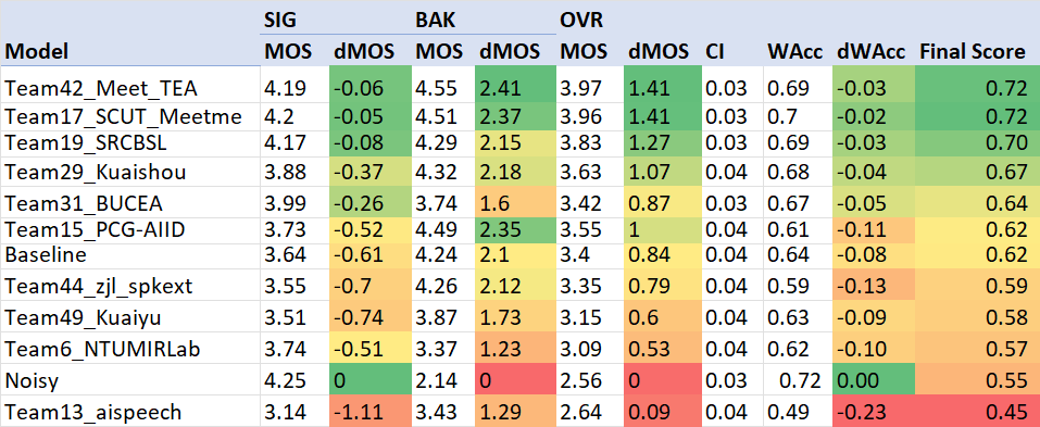Results: P.835 subjective evaluation for Track 1 non-personalized DNS. DMOS is difference of MOS between enhanced speech and noisy speech.