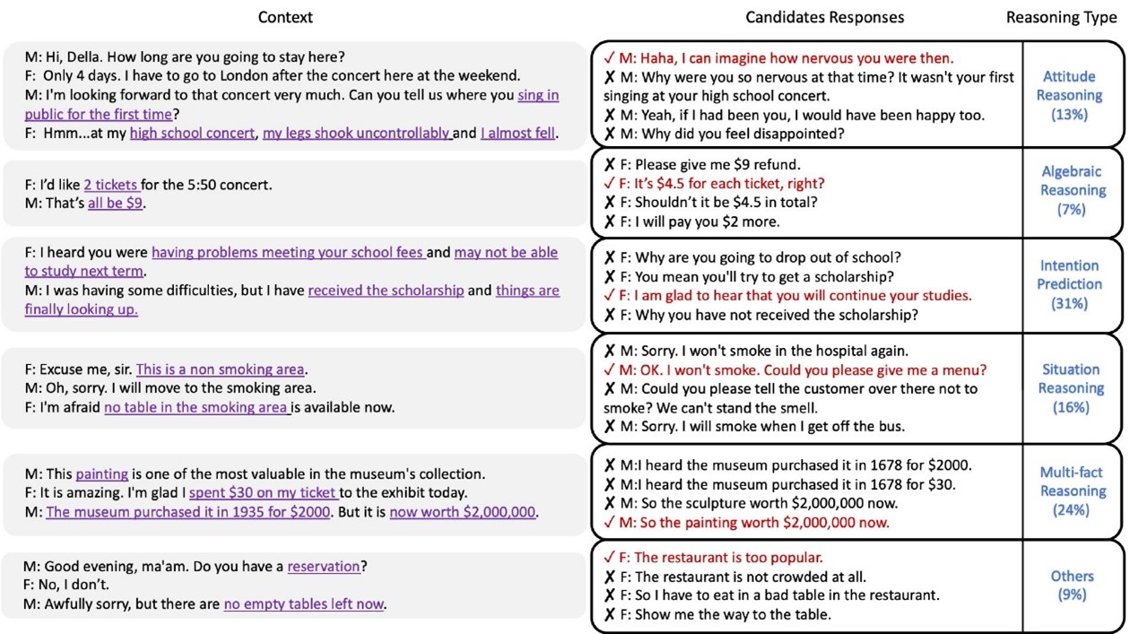 The specific types of reasoning are categorized into six types (Figure 3), including attitude reasoning (13%), algebraic reasoning (7%), intention prediction (31%), situation reasoning (16%), multi-fact reasoning (24%), and other commonsense reasoning (9%). These six types of reasoning are considered the most relevant to real chatbots. For example, it enables chatbots to make personal recommendations if the chatbot knows the user’s attitude. The ability of intention prediction allows chatbots to respond more intelligently in a long conversation session.
