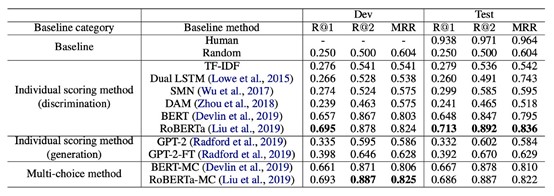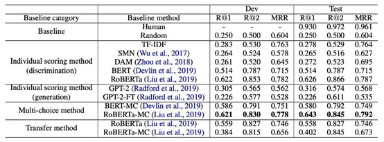 As shown in Table 1, TF-IDF is only slightly better than random guessing, which indicates that there is no obvious statistical clue between context and positive response. All models performed significantly worse than on other popular conversation datasets. We can see that well-designed matching models, such as SMN and DAM, did not deliver better performance than simple dual LSTM. Moreover, individual scoring methods and multi-choice methods showed similar results. Even the best performance model RoBERTa-base still lagged far behind human performance by 23 points on R@1.