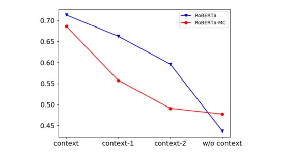 Figure 5: Ablation of contextual information. “W/o context” means all contexts are removed, so models only predict the correct choice based on four candidates. “Context-n” denotes that the earliest n utterances are removed.