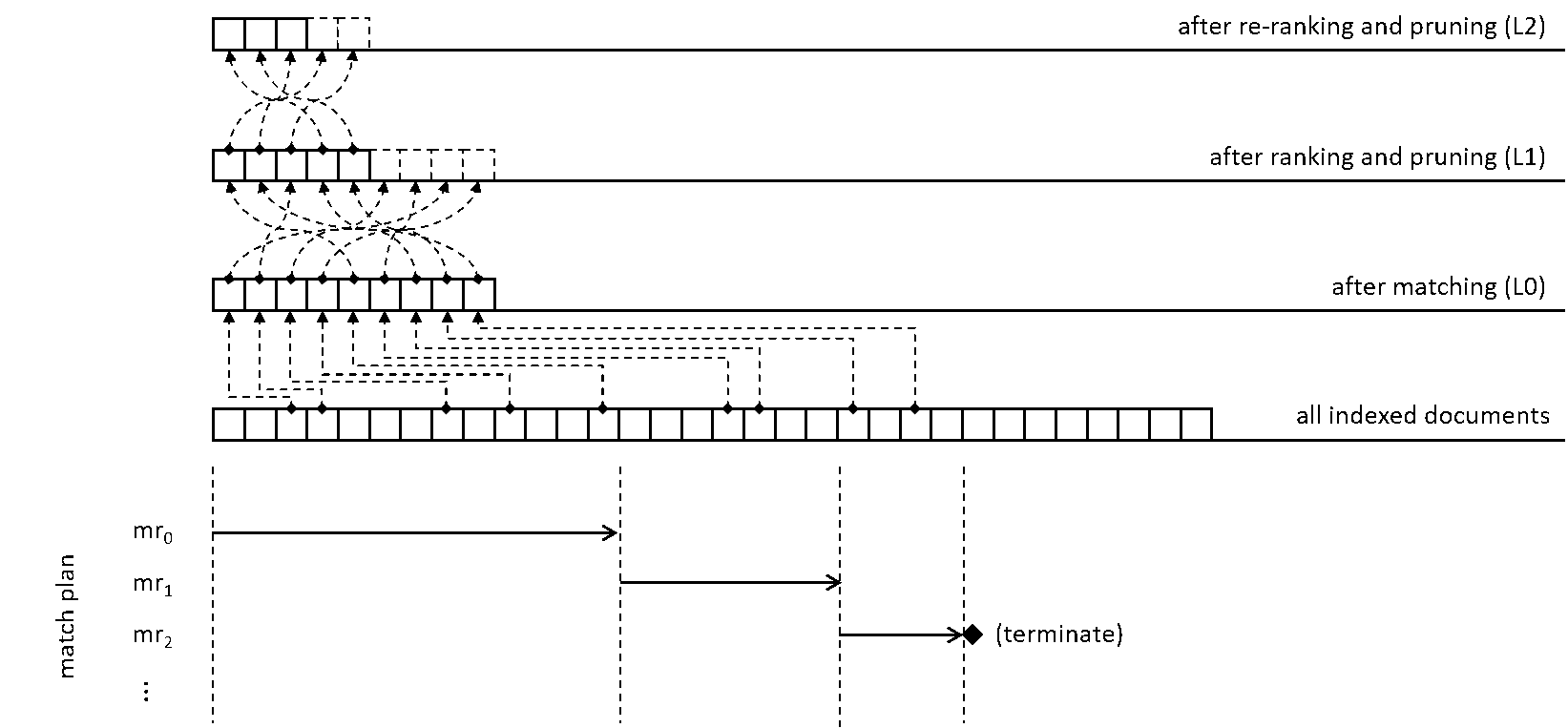 Figure 2 – A cascading architecture employed in Bing’s retrieval system. Documents are scanned using a pre-defined match plan. Matched documents are passed through additional rank-and-prune stages.