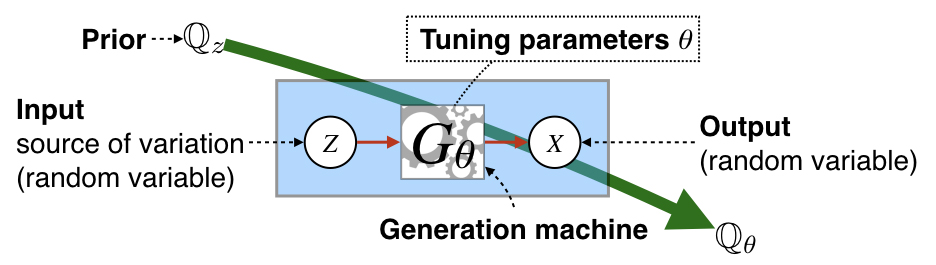 As an illustrative example, suppose we have a generative process that takes an input variable (such as noise) that it transforms through some set of tuning parameters, θ. For this process we are not only interested in the quality of the output, but the cumulative statistics (for example, frequencies of color, shape, and so on). In general, the generative process induces a probability distribution, Qθ, that is a function of some input distribution Qz (often called a prior, that can be over noise but also known variables), and the parameters of the generation machine, Gθ. See Figure 1.