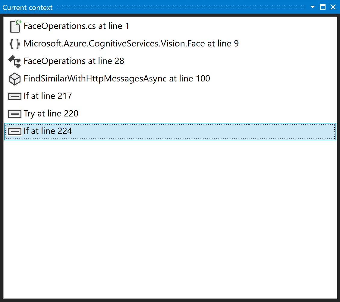 - Get context: Describes the current location of the cursor in the code file by displaying in an accessible window, the hierarchy of code structures (blocks, functions, classes and namespaces) that enclose the current location.
