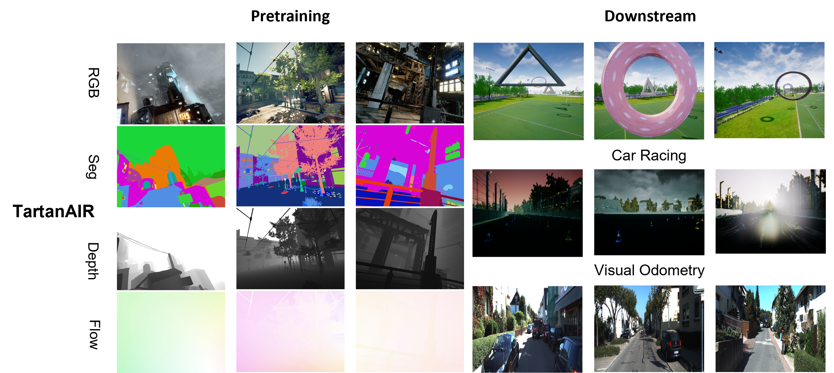 We demonstrate the effectiveness of COMPASS as a general-purpose pretraining approach on three downstream tasks: simulated drone navigation, simulated vehicle racing, and visual odometry. Figure 4 and Table 1 show some details about both our pretraining as well as downstream task datasets.