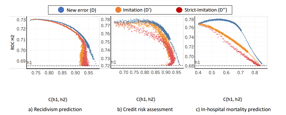 Figure 2: Performance of the updated model (ROC H2) versus compatibility with previous version (C(h1, h2)) for a logistic regression classifier. The reformulated training objective offers an explorable performance/compatibility tradeoff, which in this case is more forgiving over the first half of the curves. Each curve—new error, imitation and strict-imitation—represents a different formulation of the dissonance function, further described in the paper.