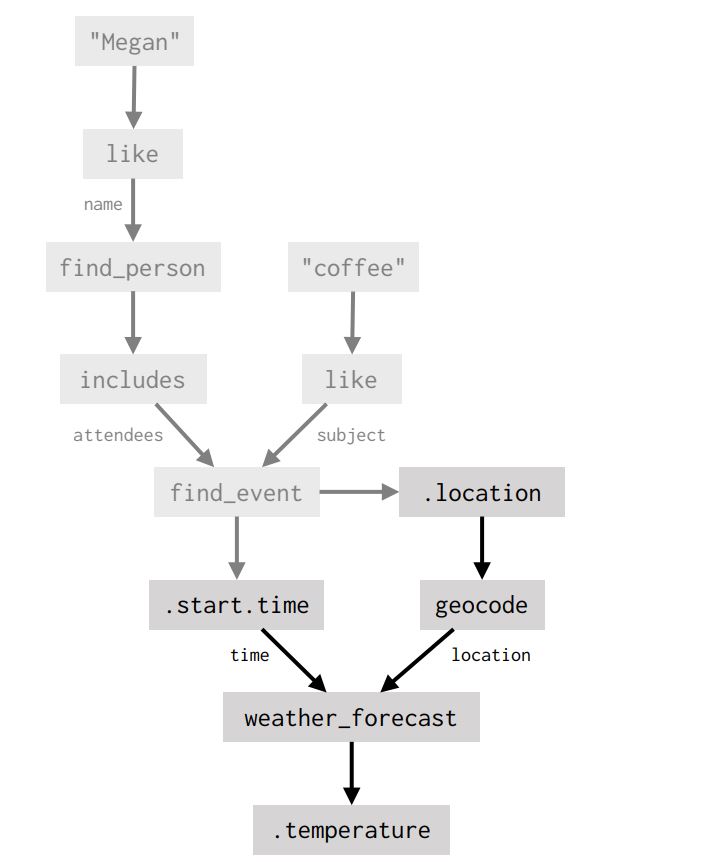 But what about more complicated requests, like What’s the temperature going to be like when I get coffee with Megan? Answering this question requires a dialogue agent to do a series of different things: figure out who Megan is, look up the event with Megan in a calendar application, figure out its start time, and use the time to query a weather service. Rather than requiring system builders to create a specialized weather_during_event_with_person intent, we translate the natural-language request into a program that ties all of these calls together. We represent this program as a dataflow graph that explicitly defines data dependencies (edges) between the steps (nodes) in the dialogue agent’s plan: