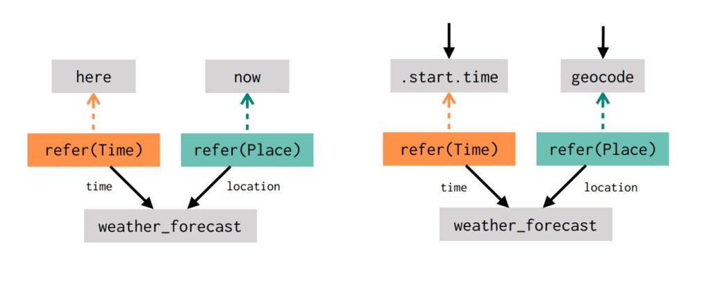 Such references can also happen implicitly. Imagine asking your device What’s the weather going to be like? Normally you mean the weather in the near future. But if you asked the same question after a future event has been mentioned, you’d likely be inquiring about the weather during that event and at the event’s location. Ultimately, these two cases require two different computations. Below, the computation on the left would be used for the near-future interpretation presented above. The computation on the right would be used for the latter event-specific interpretation: