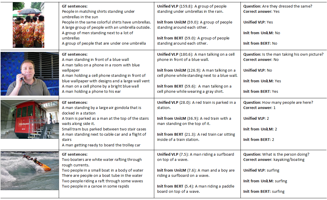 Figure 2: The above table shows qualitative examples on COCO and VQA 2.0. The first column indicates images from the COCO validation set. The second column shows the five human-annotated ground-truth (GT) captions. The third column indicates captions generated by three different models and their corresponding CIDEr scores, a metric used to evaluate caption quality. Only Unified VLP has vision-language pre-training. The last column shows VQA questions and correct answers associated with the image and answers generated by the models. The top two are successful cases and the bottom two are failed cases.