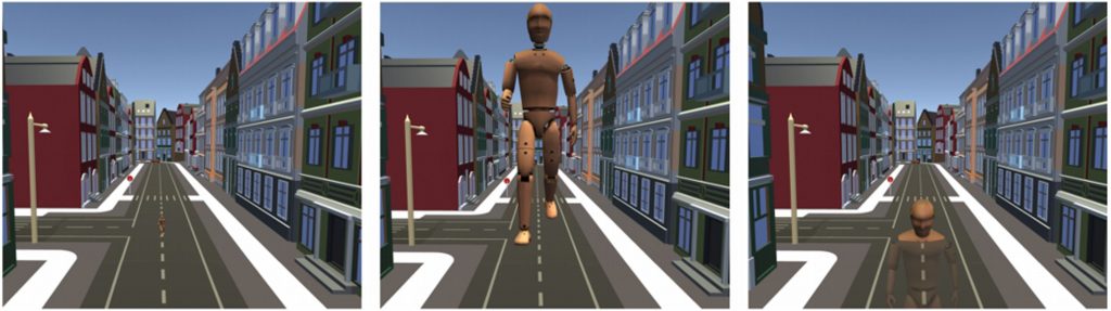Figure 2: The virtual city as seen by a user walking in its main street at a regular scale (left). The user walking down the same street while scaled to a giant (center). When researchers maintained the user’s point of view at ground level, users achieved a natural fast motion with good control.