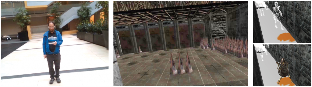 The user can avoid moving obstacles such as people or pets by the positioning of virtual objects in the game world—such as skeletons roaming the dungeon, or spikes and trap doors that spring from the floor to divert the user from any potential collisions (see Figure 5.)