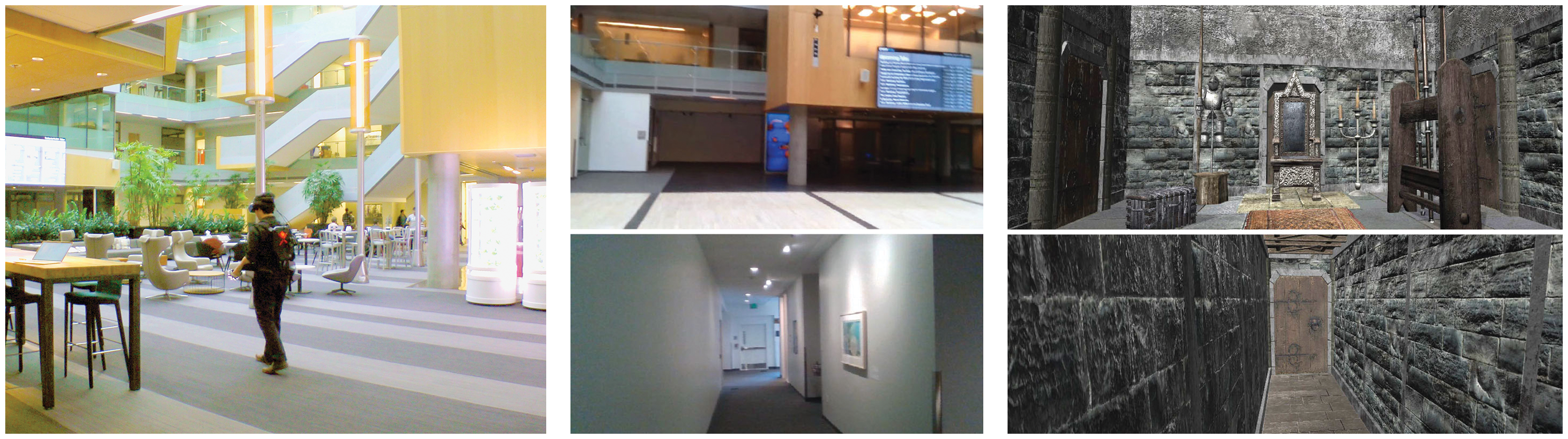 Figure 3: In current virtual reality systems, users wander around a large virtual world (left) while being physically confined to a small empty room (center). Microsoft Research has now developed VRoamer, a VR system that enables users to physically walk in a large natural building environment while keeping the user safe and maintaining story.