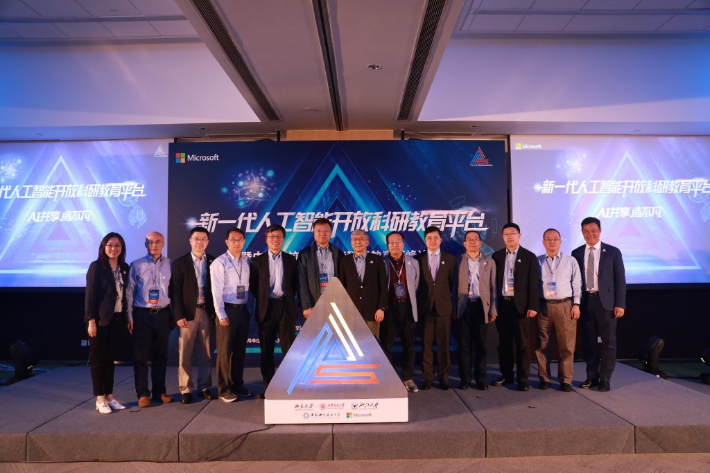 From left to right: Xin Ma (1st), Lidong Zhou (4th), Harry Shum (5th), Hisao-Wuen Hon (9th), and Tim Pan (13th) of Microsoft Research Asia with the lab’s Chinese university partners at the launch of the OpenMind artificial intelligence education and research platform.