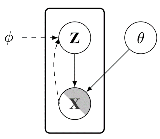 The PA-BELGAM model is based on the variational autoencoder model. The key differences are the ability to handle missing elements of the data and the Bayesian treatment of the decoder weights θ. Instead of using a standard deep neural network as the decoder to map data from a latent representation, we use a Bayesian neural network, and we put a prior distribution over the decoder weights θ.