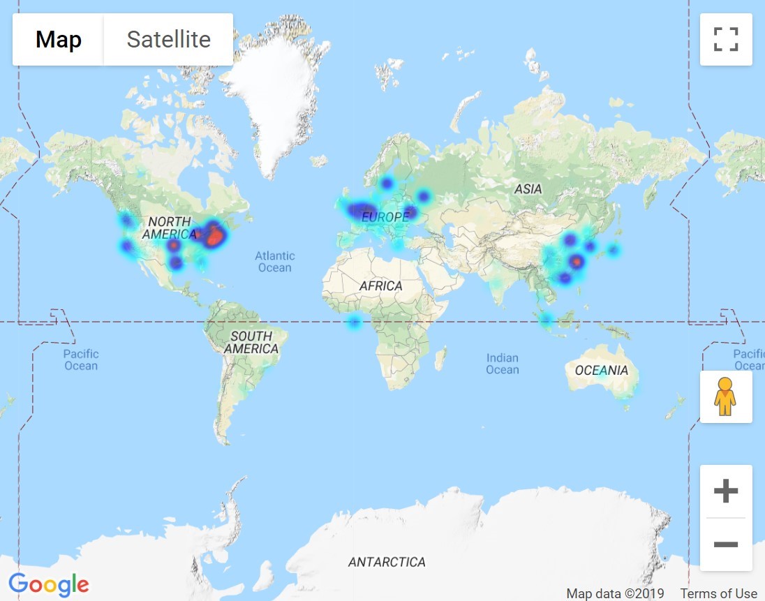 Ethereum nodes are located around the world. Locations are as of July 4, 2019. Source: https://www.ethernodes.org