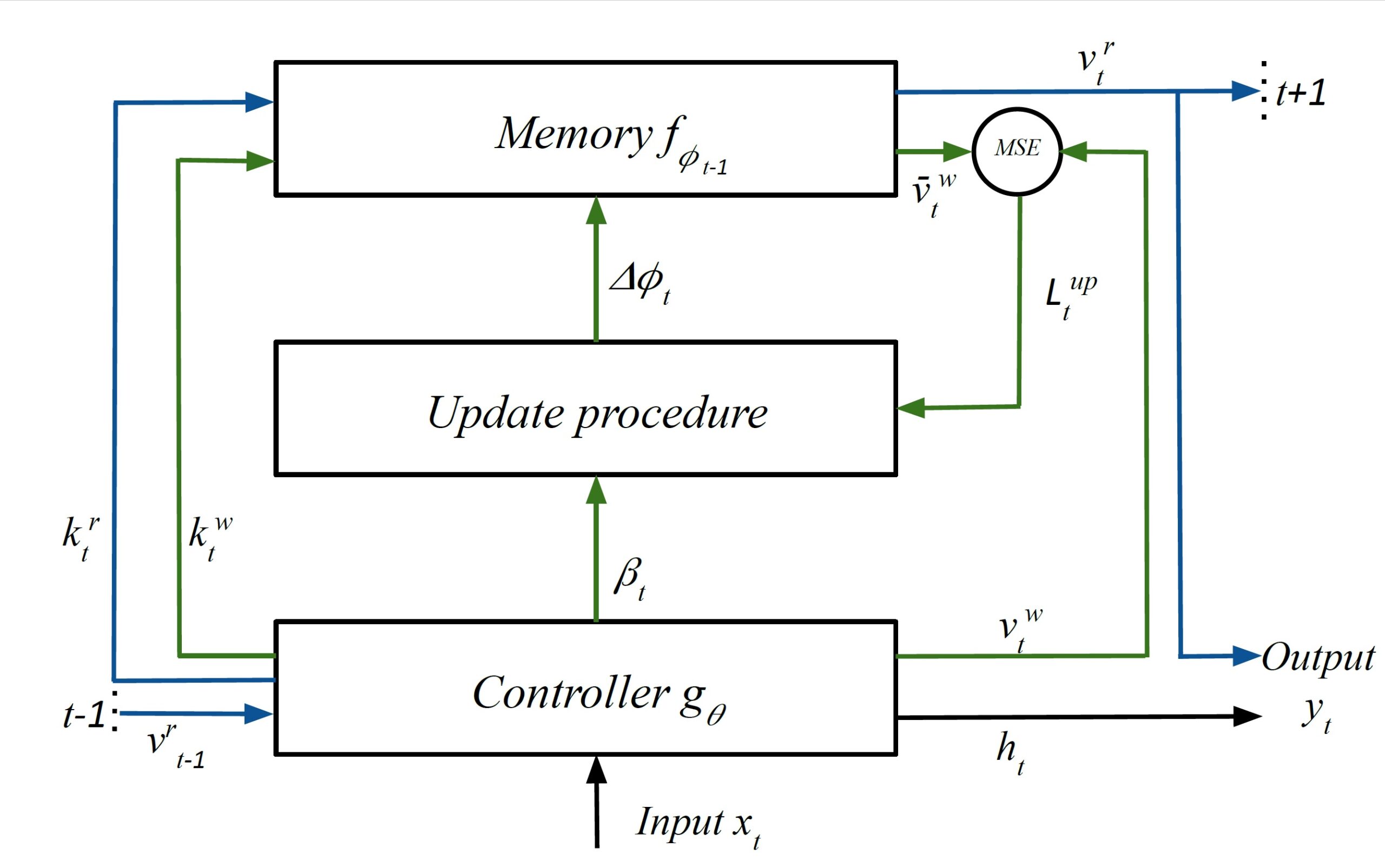 Figure 1: Metalearned Neural Memory (MNM) employs a feedforward network for memory and a recurrent neural network controller for writing to and reading from the memory. In the above illustration of the model, green and blue arrows indicate data flows for writing and reading operations, respectively.
