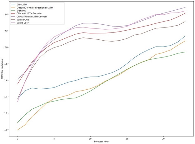 Figure 3 shows the wind speed predictions at the 24th hour over a period of 10 days with one-hour resolution. Figure 4 plots the RMSE (Root Mean Squared Error) for each hour prediction and compares with other models. DeepMC shows significantly better performance and is more likely to follow the details and trends of the time series data. Other models used for comparison (in this case for wind speed) are the CNNLSTM model, modified CNNLSTM with LSTM decoder, regular convolutional network with LSTM decoder, a vanilla LSTM-based forecaster, and a vanilla CNN-based forecaster. Of interest: the performance of all models decreases as the horizon of prediction increases, which is to be expected, as it is more accurate to predict the next immediate hour versus a forecast on the 24th hour. Figure 5 plots the RMSE, MAE (Maximum Absolute Error) and MAPE (Maximum Absolute Percentage Error) values for micro-wind speed predictions using various models, averaged over all 24-step predictions.