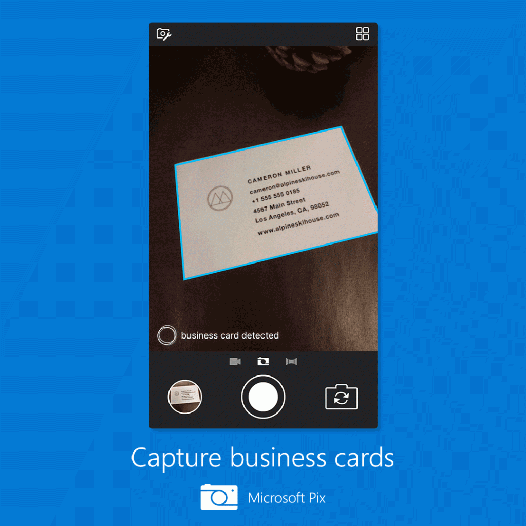 Business Card adds to existing productivity enhancing features already available in Microsoft Pix. As many of you know, Pix automatically detects whiteboards and documents in real time and intelligently adjusts camera settings for these types of photos. The app uses AI to enhance the image, such as cropping edges, boosting color and tone, sharpening focus and tweaking the angle to render the image in a straight-on perspective.