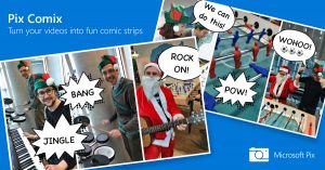 The second feature, Pix Comix, was developed during Microsoft’s OneWeek hackathon and makes use of the core Pix feature Moment Capture in an innovative new way: identifying the most interesting frames in a video to generate a comic strip. Pix uses its deep learning model to score and select three high-quality frames, searching specifically for non-blurry photos, faces with eyes open and interesting scenes.