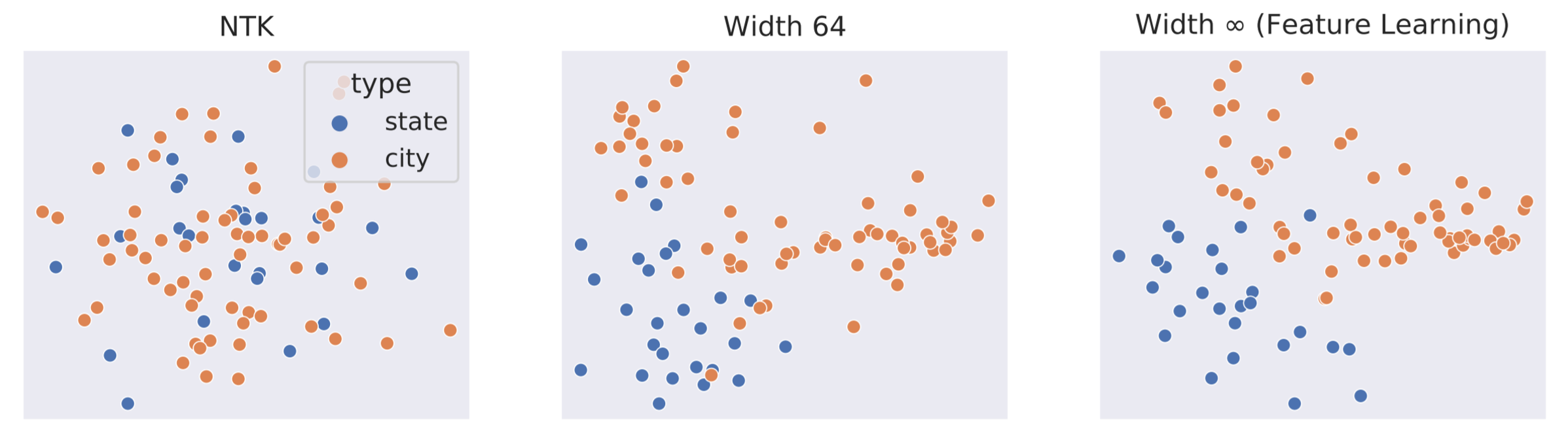 Maximal Update Parametrization \((μP)\), which follows the principles we discussed and learns features maximally in the infinite-width limit, has the potential to change the way we train neural networks. For example, we calculated the \(μP\) limit of Word2Vec (opens in new tab) and found it outperformed both the NTK and NNGP limits as well as finite-width networks. When we visualize the learned embeddings of two groups of words—the names of American cities and those of states—using Principal Component Analysis (opens in new tab), we see that μP limit exhibits a clear separation between them, like in the finite neural network, while the NTK/NNGP limit sees essentially random embeddings.