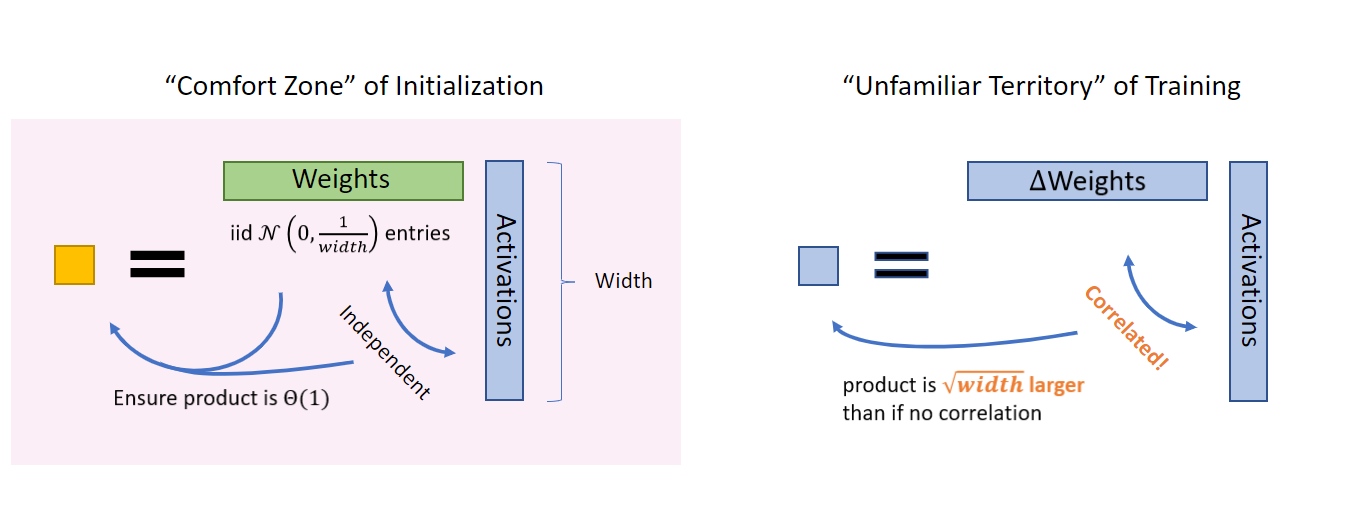 Why do NNGP and NTK fail to learn features? Because to do so, we need to leave the “comfort zone” of model initialization, where the activation coordinates are easy to analyze as they nicely follow a Gaussian law by a central limit argument (opens in new tab)—that is, summing infinitely many roughly independent, zero-mean random variables should yield a Gaussian distribution with a known variance. Just like growing a plant entails not only planting a seed but also proper care throughout its lifetime, the right infinite-width limit should take into consideration both the model initialization and the gradient updates, especially far away from initialization. To unlock feature learning, we need to see gradient updates for what they really are: a different kind of matrices from their randomly initialized counterparts.