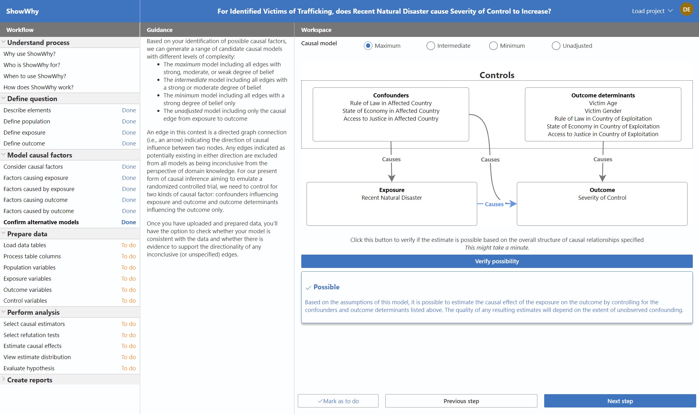 Just as ShowWhy aims to make the practice of causal inference accessible to many for the first time, the Global Human Trafficking Synthetic Dataset (opens in new tab) similarly makes available, for the first time, rich microdata describing all victims of trafficking identified by CTDC data contributors. At the upcoming Microsoft Research Summit (opens in new tab), October 19–21, 2021, we’ll show how this combination of resources can enable community-generated evidence in support of, for example, the link between crises and trafficking (opens in new tab) reported by IOM.