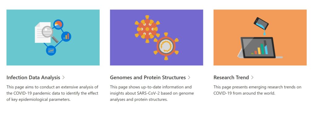 The COVID Insights website mainly consists of three major sections: Infection Data Analysis, Genomes and Protein Structures, and Research Trends. It visually and interactively displays the pandemic trends in different countries and regions; the virologic analysis of the virus that causes the disease, SARS-CoV-2; and the latest global research focuses. All data used on the website is taken from publicly available sources, including from Johns Hopkins University, the U.S. Centers for Disease Control and Prevention and the Global Initiative on Sharing All Influenza Data (GISAID), among others. Leveraging the public data, Microsoft researchers use advanced technology to discover patterns and insights to further expand thinking on the pandemic.