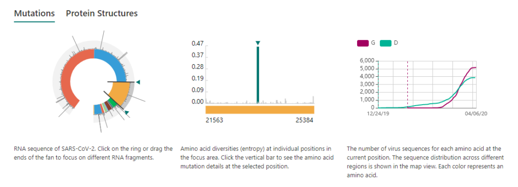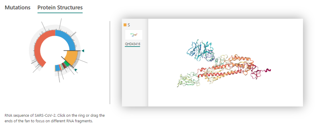 The “Genomes and Protein Structures” page presents the latest virologic analysis on SARS-CoV-2. Up until now, the novel coronavirus has evolved many genetic variants. Here, visitors to the website can interactively explore the amino acid mutations and their positions in the genome sequence, the geographic location of the mutations, and the corresponding protein structure.